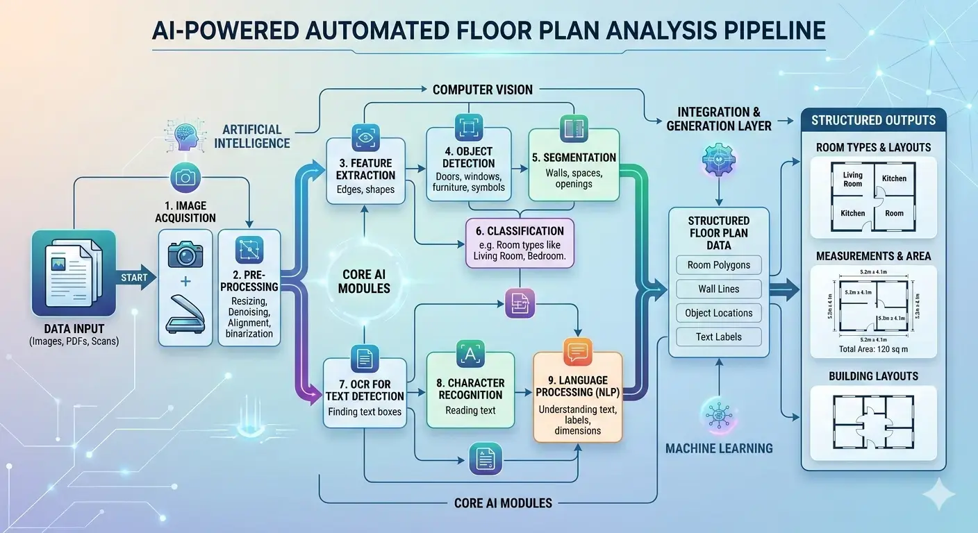 Modern floor plan recognition typically uses two AI pipelines in tandem: