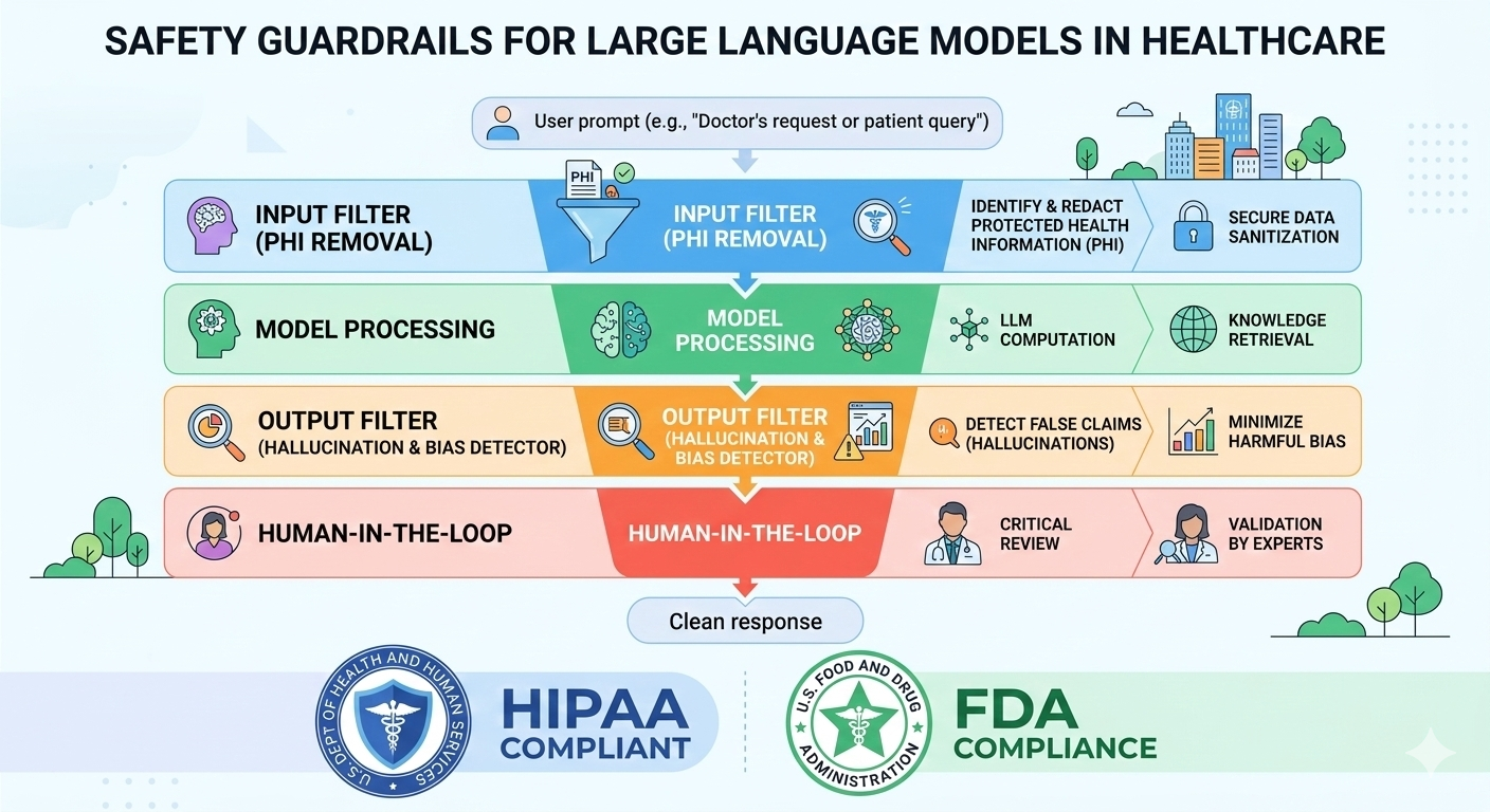 TL;DR: Large Language Models (LLMs) offer transformative potential for healthcare, but their deployment requires rigorous safety guardrails. This article outlines the essential technical, regulatory, and operational controls—including HIPAA compliance, input/output filtering, and human-in-the-loop verification—necessary to protect patient data and ensure clinical safety.